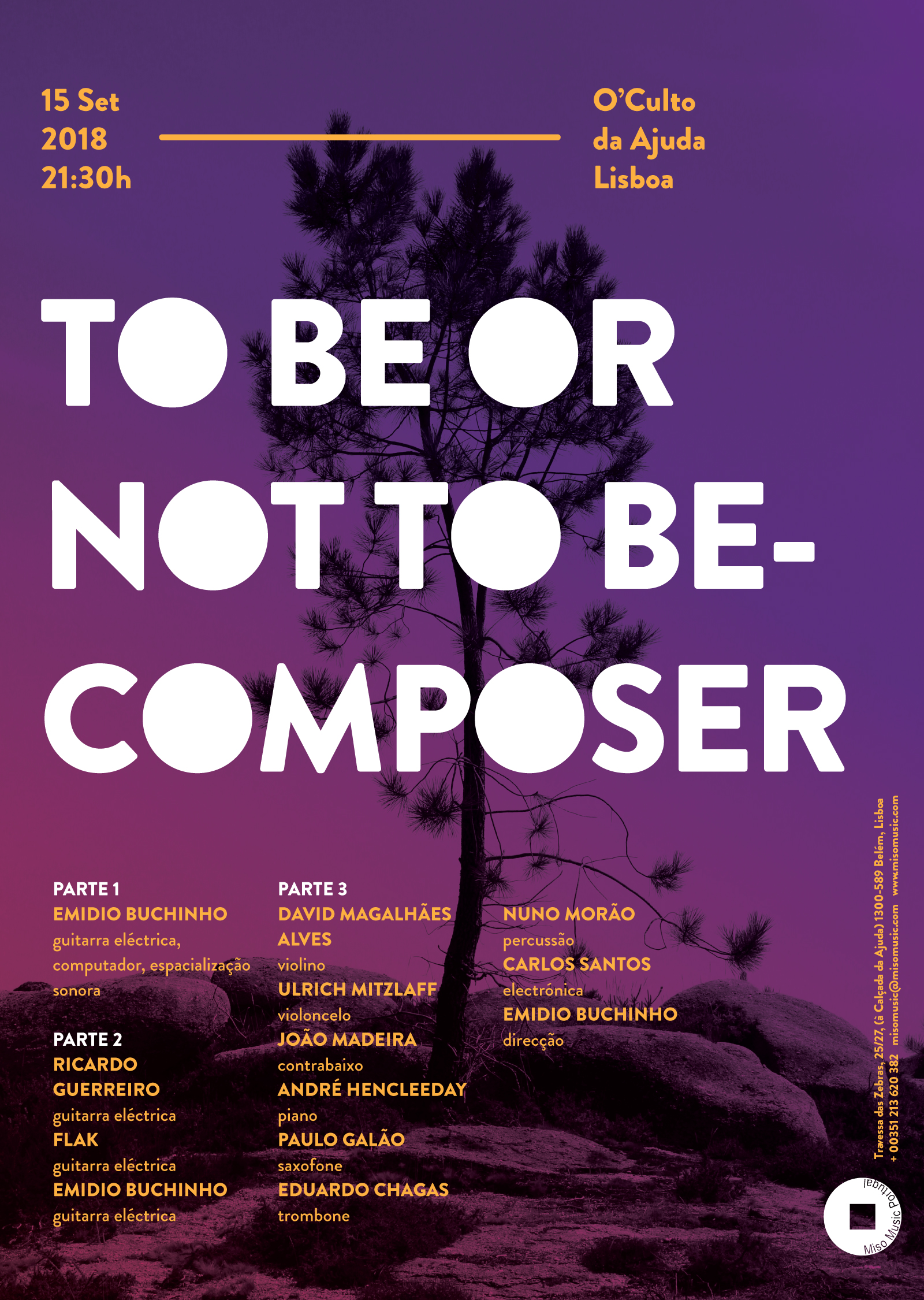 15 de Setembro de 2018 | 21h30 | O'culto da Ajuda | Lisboa TO BE OR NOT TO BECOMPOSER . Emídio Buchinho Em contexto de residência de criação no O’Culto da Ajuda, Emidio Buchinho apresentará um conjunto de peças electroacústicas cujos processos principais de criação são os da improvisação livre, da composição aleatória e da composição colaborativa. Para isso, terá por instrumento a guitarra eléctrica expandida com captação polifónica, para processamento e mapeamento das cordas individuais, podendo assim dirigi-las para diferentes pontos do espaço, numa procura da integração do processo de difusão [...]
