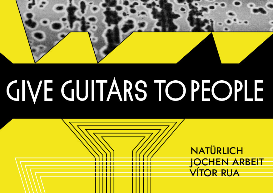 | 16 de Março de 2019 • 21h • O'culto da Ajuda | Lisboa ARBEIT | NATürlich | RUA Uma improvisação meta-idiomática. Projeto de Música Concreta Não é necessário ouvir um rouxinol durante horas para se encantar; um canto isolado é suficiente. Bastam alguns segundos a escutar o som das cigarras para nos maravilharmos com uma textura tão refinada. Um único momento ouvindo as ondas do mar é relaxante. GIVE GUITARS TO PEOPLE lida com "experiências sonoras" isoladas em que cada módulo é autónomo e auto-suficiente. É uma experiência de improvisação colectiva; três guitarras como meio central e privilegiado na procura de uma sonoridade única. A dinâmica entre os músicos conduz a um encontro meta-idiomático, uma conversa que une os seus múltiplos vocabulários numa estética de diversas variáveis que se funde em si mesma. GIVE GUITARS TO PEOPLE resulta das frentes idiomáticas de Vítor Rua (Telectu, Vítor Rua & The Metaphysical Angels), Jochen Arbeit (Einstürzende Neubauten/Automat/ASS) e NATürlich (a.k.a. Patrícia Bateira) com uma função esquizofrénica de fluxos intermitentes e disruptivos, criados sem uma aparente relação entre eles, excepto o puro encanto de construir uma cadeia musical abstracta. © 2018-19, [ ARBEIT | NATürlich | RUA ] Apoios: