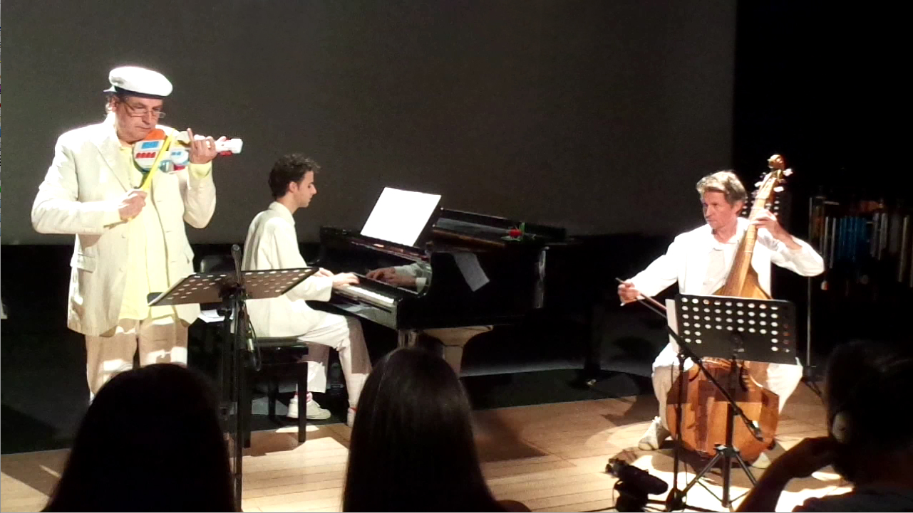 “Quando se espera um violino, temos um violino Chicco (um toy instrument, que já não se fabrica, da famosa marca, mas com muitas possibilidades musicais), e quando se espera um violoncelo, temos um violone barroco (a meio caminho entre o contrabaixo e o violoncelo mas com som de viola de gamba). O interessante é que algumas características dos instrumentos “originais” mantém- se, se não sempre sonoramente, pelo menos visualmente, cumprindo a sua função ‘simbólica’ dentro da imagem tradicional de um trio com piano. (...) A raridade de um brinquedo recente, um produto entretanto descontinuado, mede-se com a raridade de um instrumento antigo, também descontinuado remotamente, mas com pedigree musicológico.” (das notas de programa, © JER 2016)